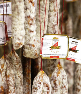 La pancetta viene disossata manualmente in modo da lasciare attaccato il magro di costa, viene salata a secco e aromatizzata con una leggerissima speziatura. Affumicata dolcemente con legno di faggio e lasciata stagionare senza fretta e senza forzature. Ideale sia da gustare affettata che per l’uso in cucina.